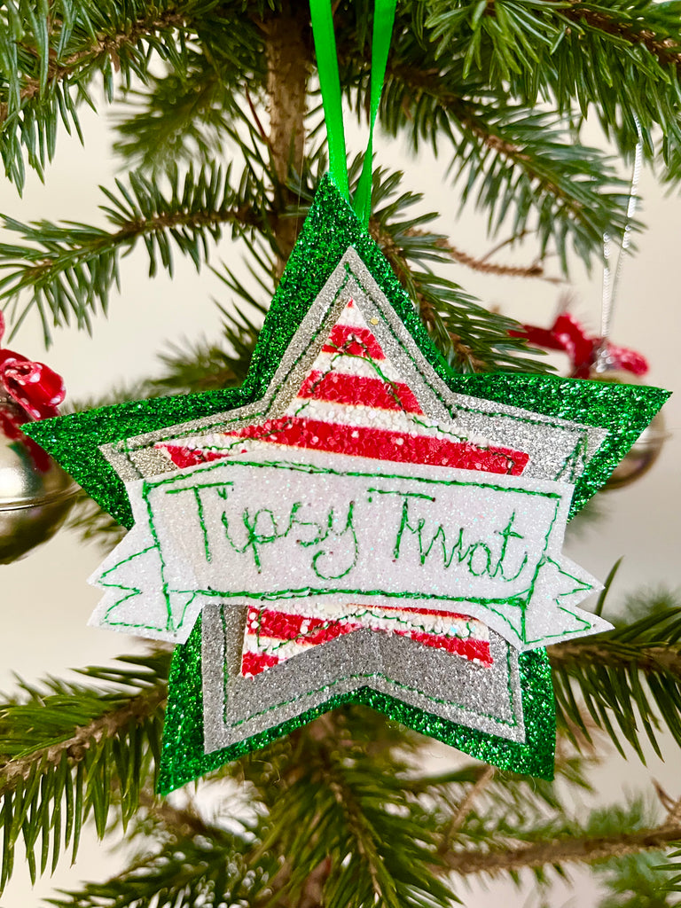 Made from 100% polyester and glitter felt. Ribbon for hanging.