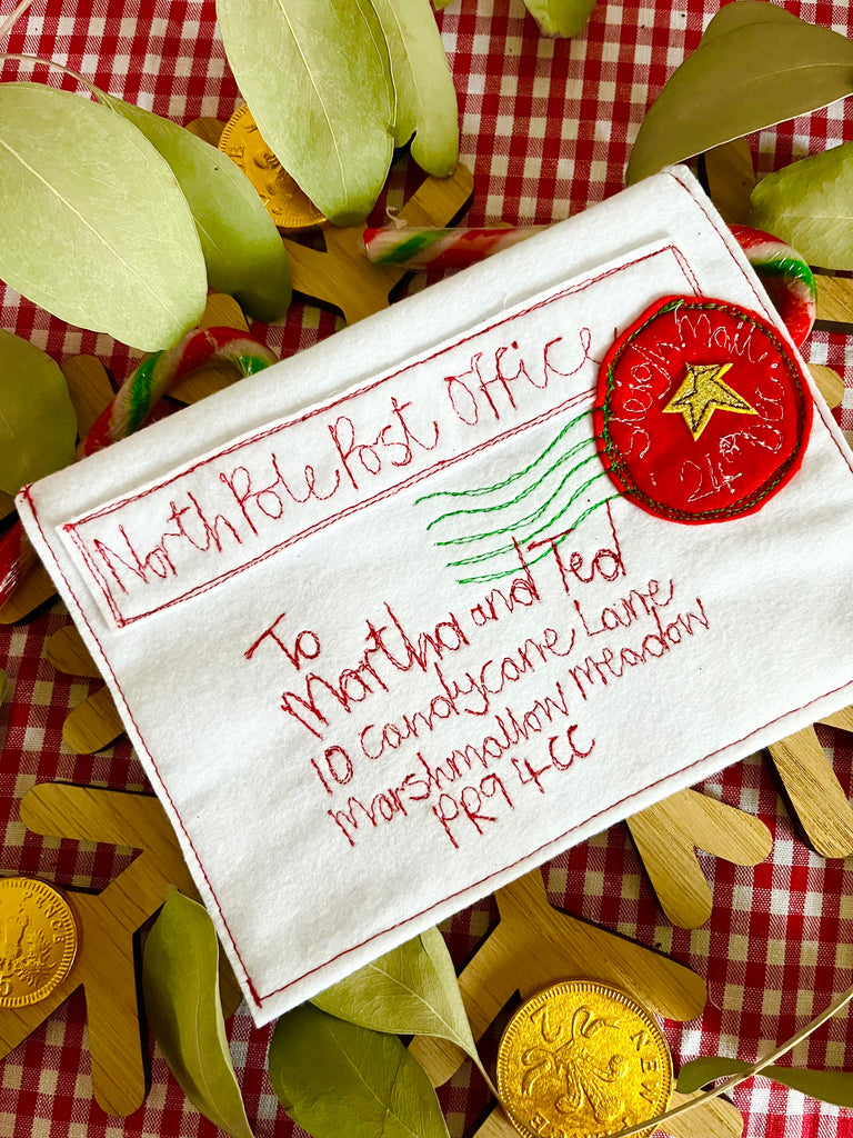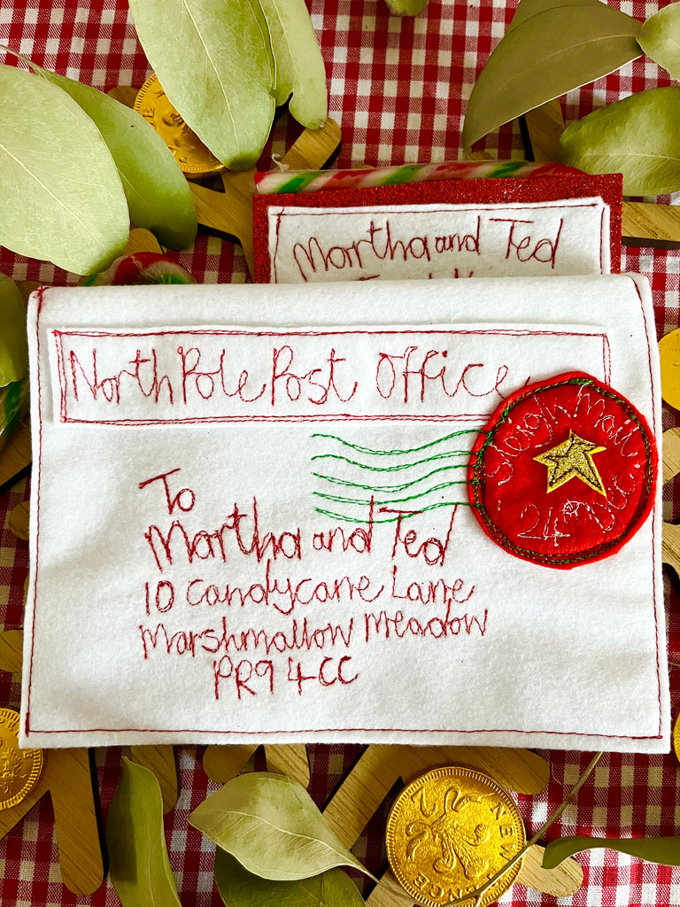 They are made from 100% polyester felt and glitter felt with a little red button to close the envelope. And measures 15cm by 11cm. The envelope measures 16.5cm by 13cm.