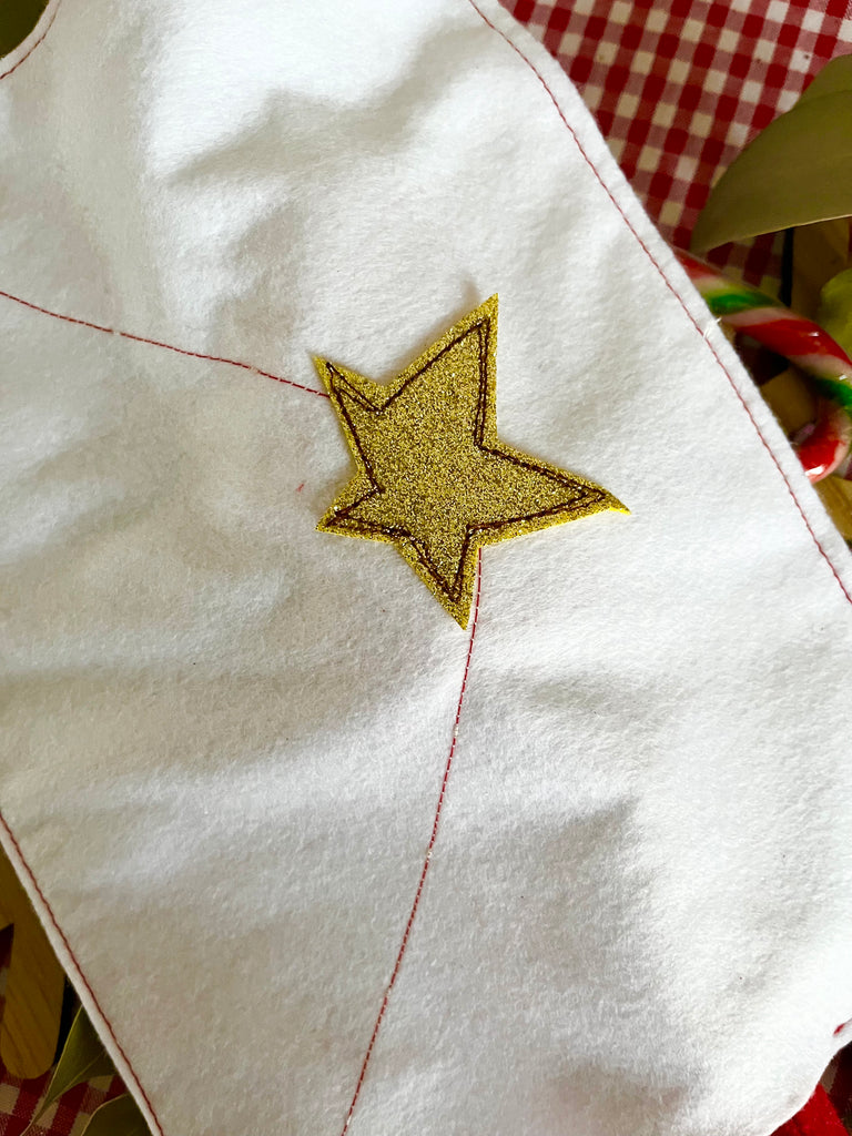 Each envelope is made from felt fabric, with red, green, and white stitching, with a special North Pole stamp.