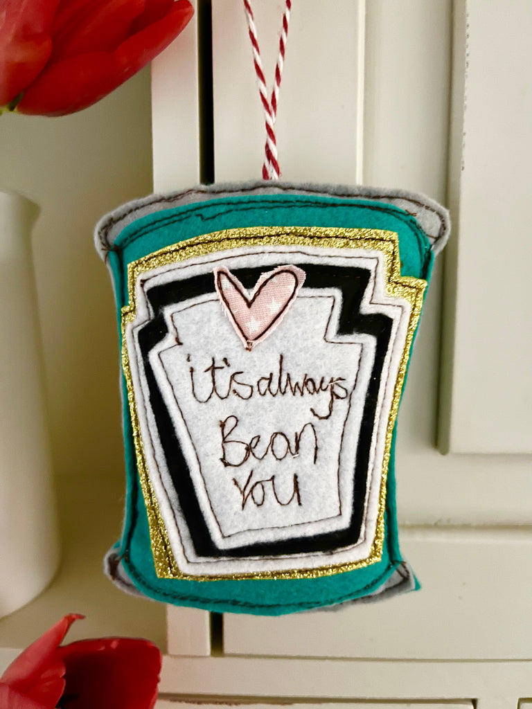 Each one is made to order using freehand machine embroidery, so each will have a slightly different look, and fabrics may also vary. The sewing machine is used to give a 'handwritten' quality and is not done on a computerised machine.