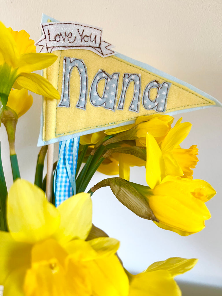 Each flag comes with the wording 'Love You', then let me know which wording you would like on the main part of the flag, for example. Mama, Nana, Mummy, Grandma. They are available in 2 different colour ways, pink and lilac or lemon and pale blue.